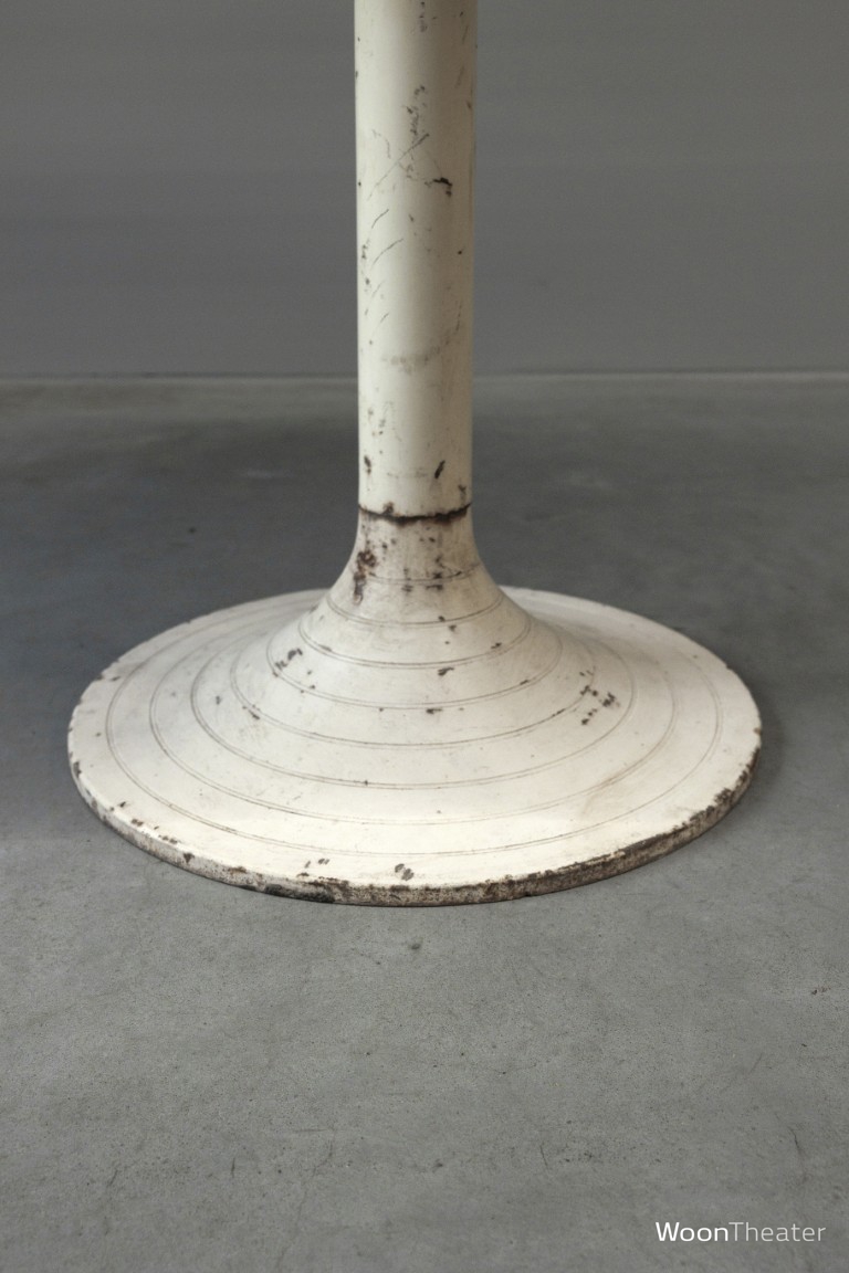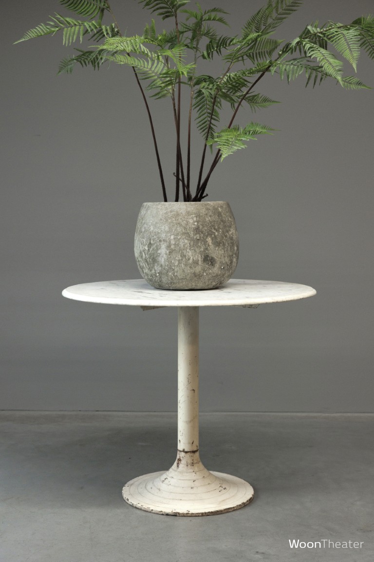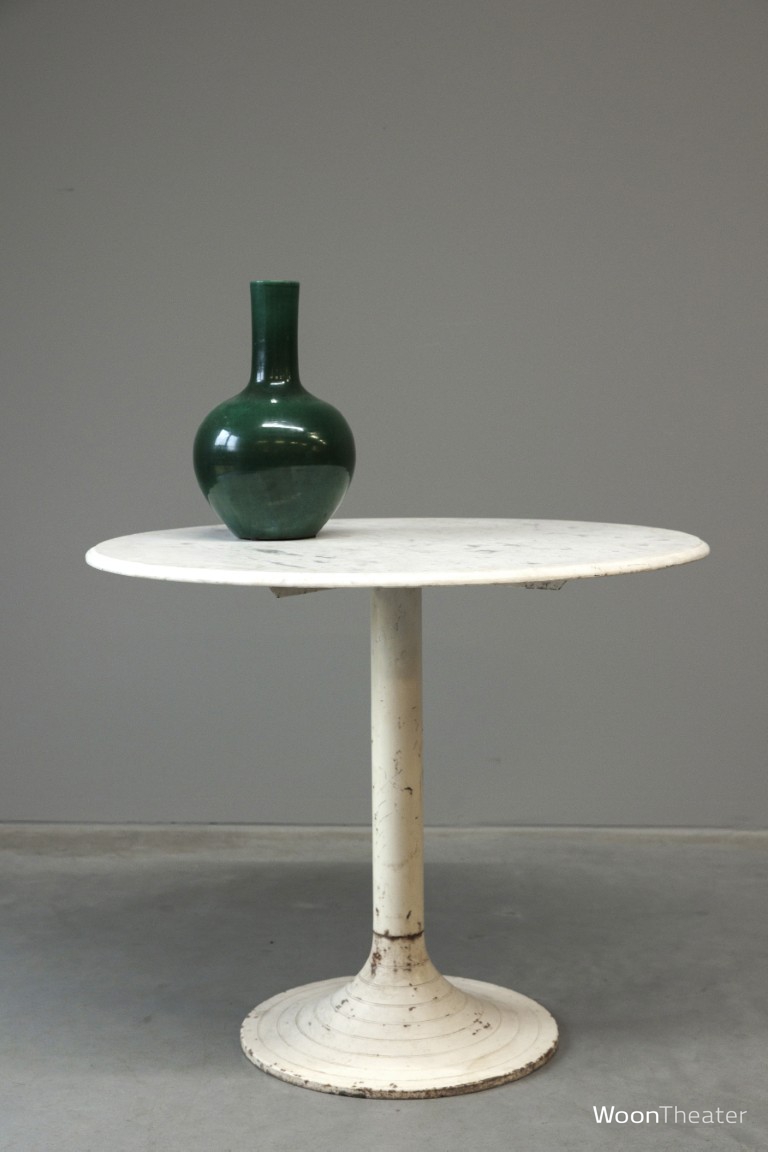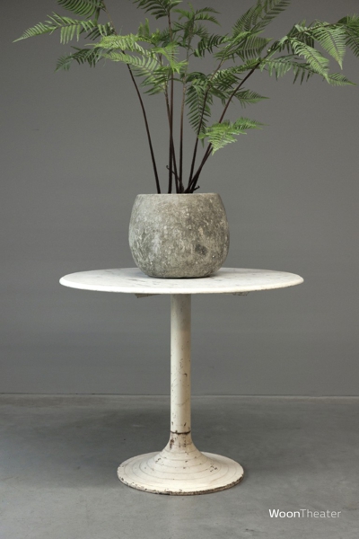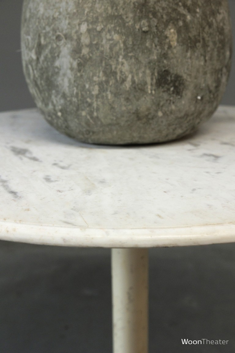 Eettafel met een rond wit marmeren blad en een witte verweerde metalen poot. Onze inkopers kochten 3 vergelijkbare tafel in India.